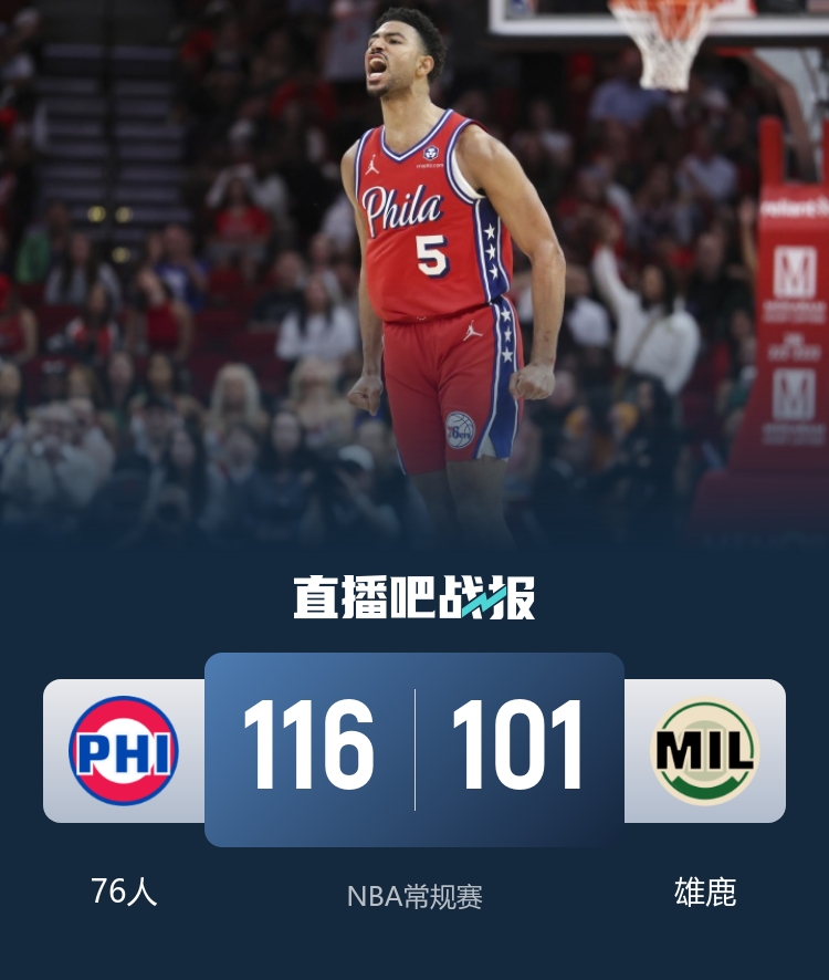 12月6日讯 NBA常规赛,雄鹿主场迎战76人。雄鹿10胜13负,76人则是12胜9负。本场比赛恩比德不打,乔治复出;字母哥继续缺阵。